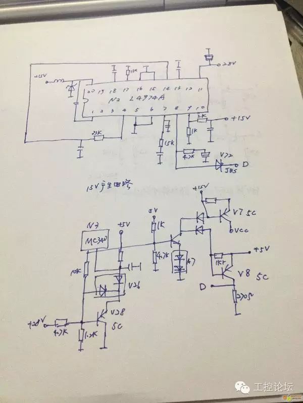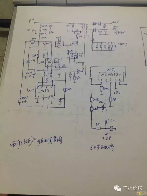 这是电源草图,电源电路采用传统的UC3844作为震荡芯片,产生28V和风扇电压输出。N5为MC33167 产生5V的工作电压。开关电源比较简单。