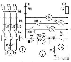 停止指示绿灯HG和运行指示红灯HR分别受接触器的常闭(动断)或常开(动合)辅助触点KMl-2、KMl一3控制,用作信号指示。电流互感器TA的二次线圈串接电流表PA,电压表PV则直接接在电源线上,它们对电动机的运行电流和电压进行。